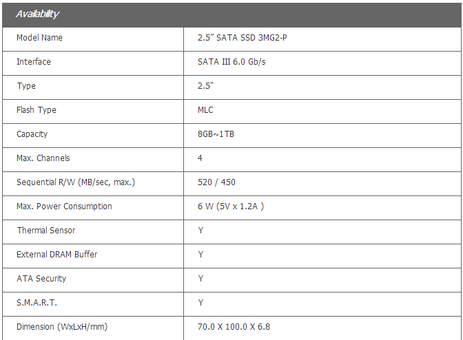 Innodisk 2.5” SATA SSD 3MG2-P is SATA III 6Gb/s flash based disk, which delivers excellent performance, especially in random data transfer rate, and which offers reliability making it the ideal solution for a variety of applications, including embedded system, industrial computing, and enterprise field. 3MG2-P 2.5” SSD not only performs unmatched performance, but also designed with Innodisk owned technical knowhow to ensure the data integrity and highest levels of reliability. Additionally, 3MG2-P SATA SSD can support device sleep mode (DEVSLP) and thus be able to benefit in extreme low power consumption.