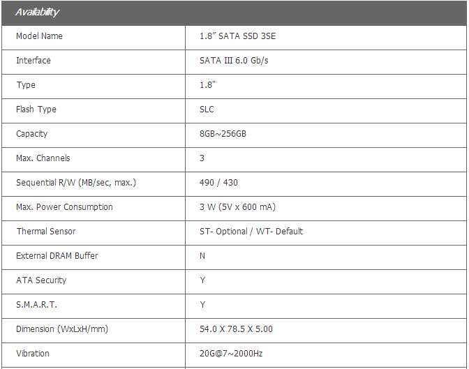 Innodisk 1.8” SATA SSD 3SE is SATA III 6Gb/s Flash based disk, which delivers excellent performance and reliability making it the ideal solution for a variety of applications, including embedded system, industrial computing, and enterprise field. 3SE 1.8” SSD not only performs unmatched performance, but also designed with Innodisk owned technical knowhow to ensure the data integrity and highest levels of reliability.