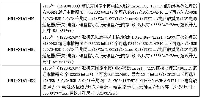 HMI-215T是一款配置21.5” LCD 液晶屏的低功耗工業(yè)級平板電腦,采用Intel多平臺低功耗處理器,Intel®Skylake SOC芯片組具有豐富的I/O 接口,該系列是面向高端MES、綜合監(jiān)控、自動化等領(lǐng)域,主要用于生產(chǎn)線MES,綜合監(jiān)控 (軌道交通,樓宇,電力等) ,醫(yī)療信息化,單晶爐機(jī),風(fēng)電等惡劣工業(yè)現(xiàn)場控制應(yīng)用規(guī)格: